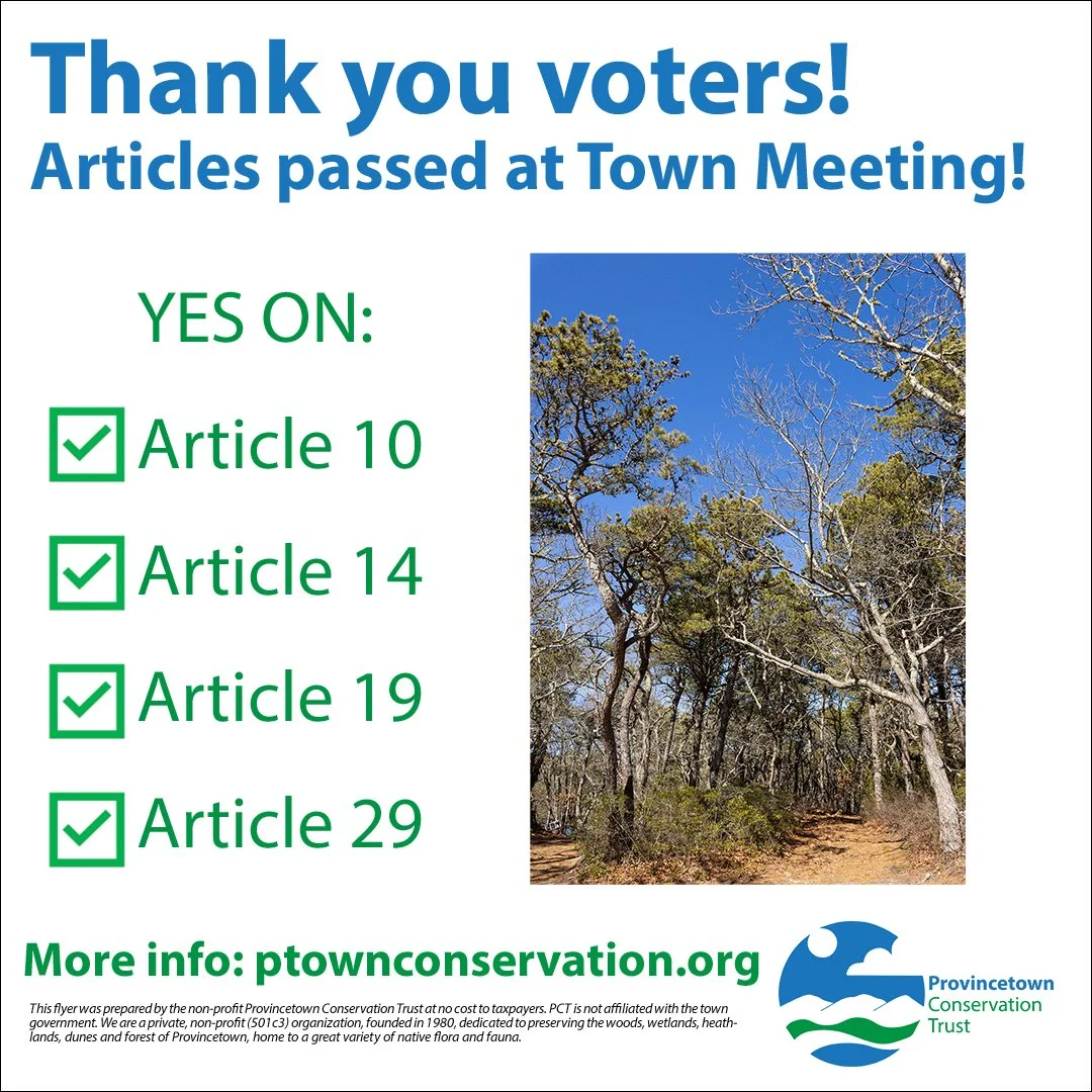 We’re pleased to share an encouraging update from this year’s Provincetown Town Meeting on Monday April 6th. Thanks to strong community support, Articles 10, 14, 19, and 29 all passed—an important step forward for local conservation efforts.