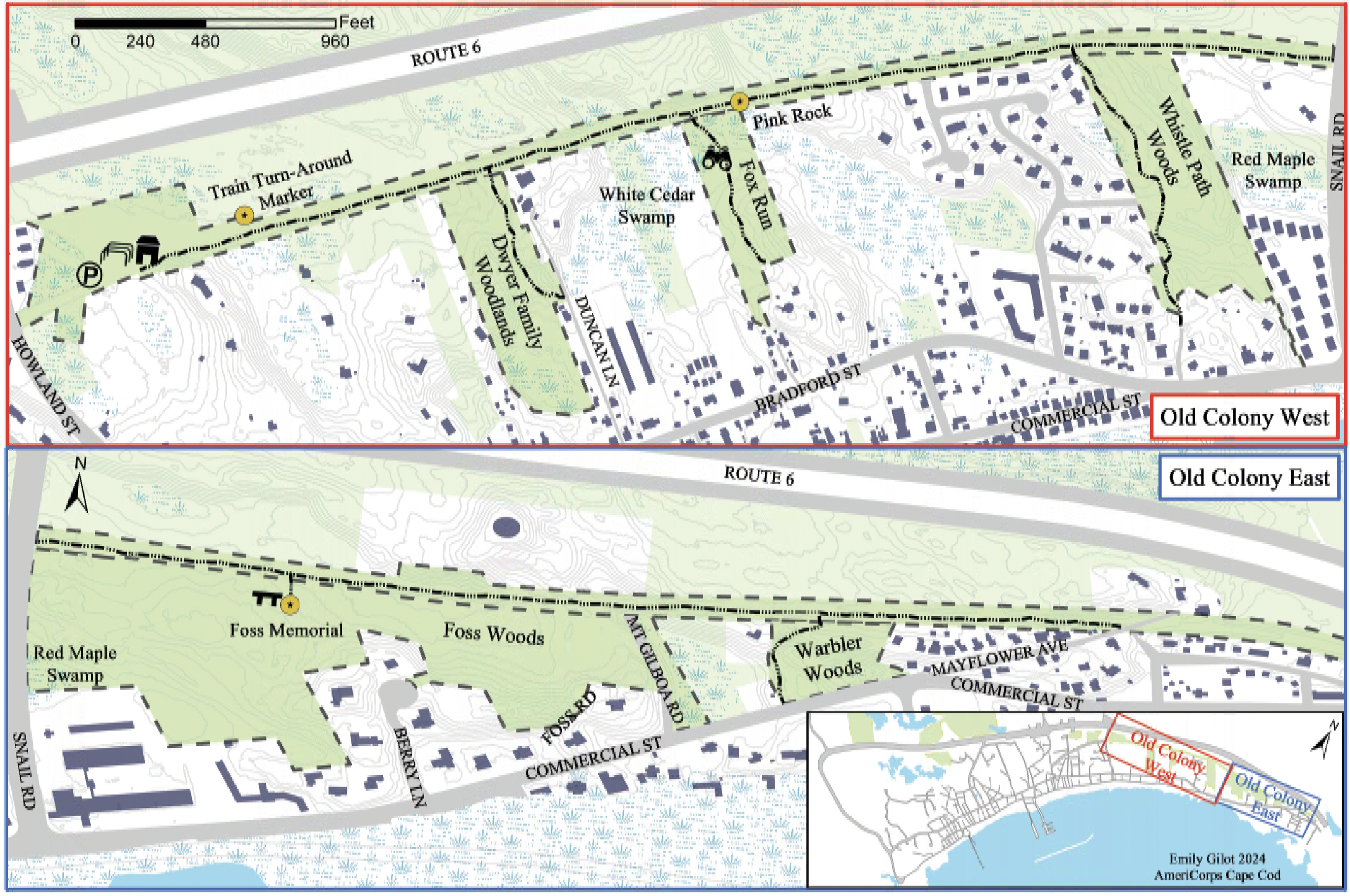 Provincetown was only accessible by boat or loose sandy roads until an extension of the Old Colony Railroad was completed in 1873, ending at what is now MacMillan Pier. Passenger service came to an end in 1940, but freight service continued until 1960. Harry Kemp Way now follows the original railroad bed, while 24 acres between Howland Street and Mayflower Heights are owned by the Town for conservation and passive recreation. Stone markers still exist near the Howland Street trailhead, indicating where a turn-around once existed for the trains. Other pieces of the railbed have been repurposed along the trail.